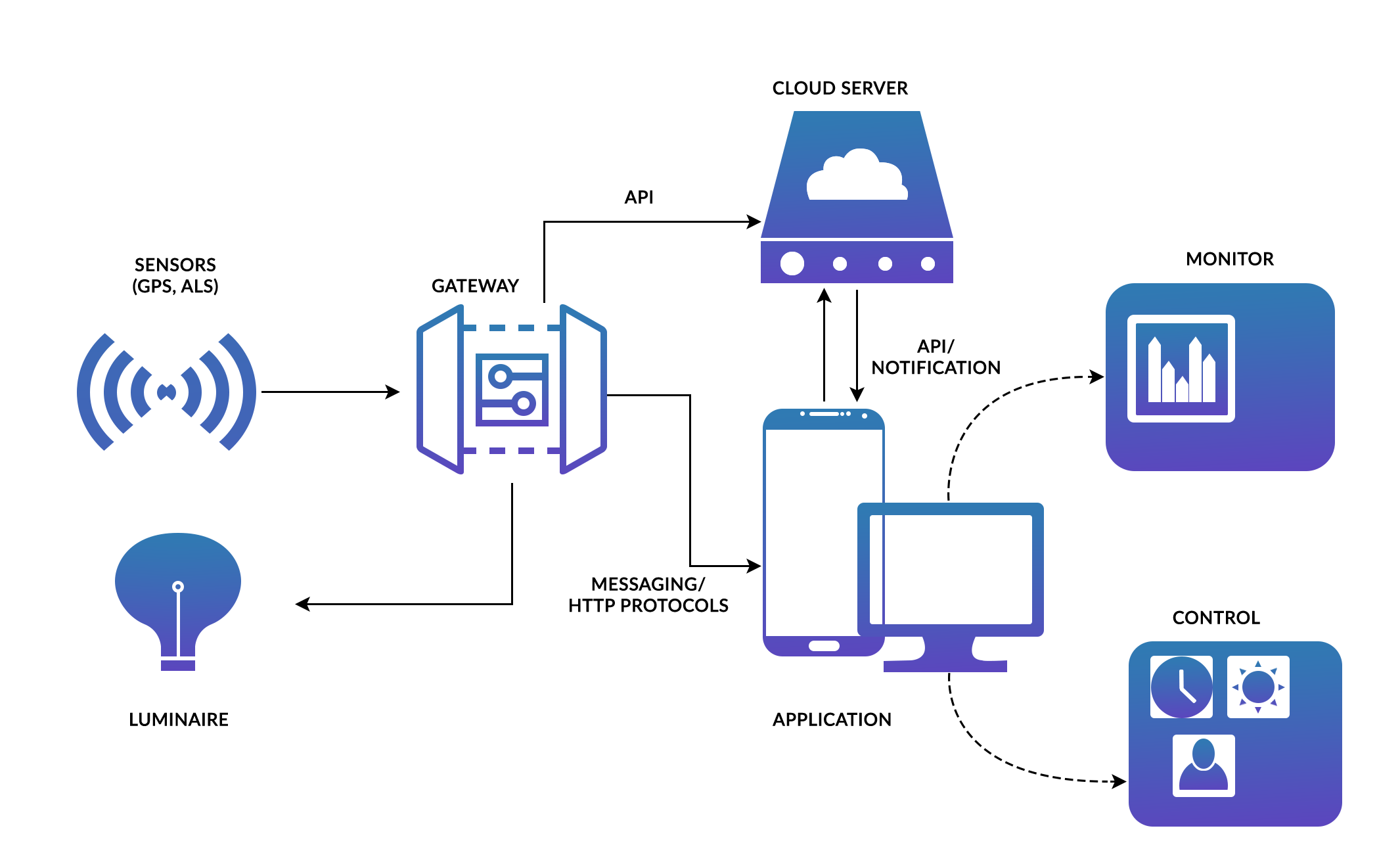 Smart Lighting solution allows us to control the brightness levels of street lights individually, street lights collectively based on region through realtime position. The light control can be done
